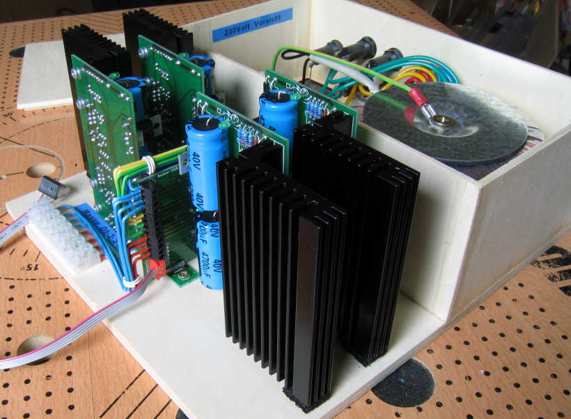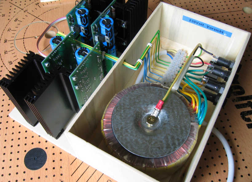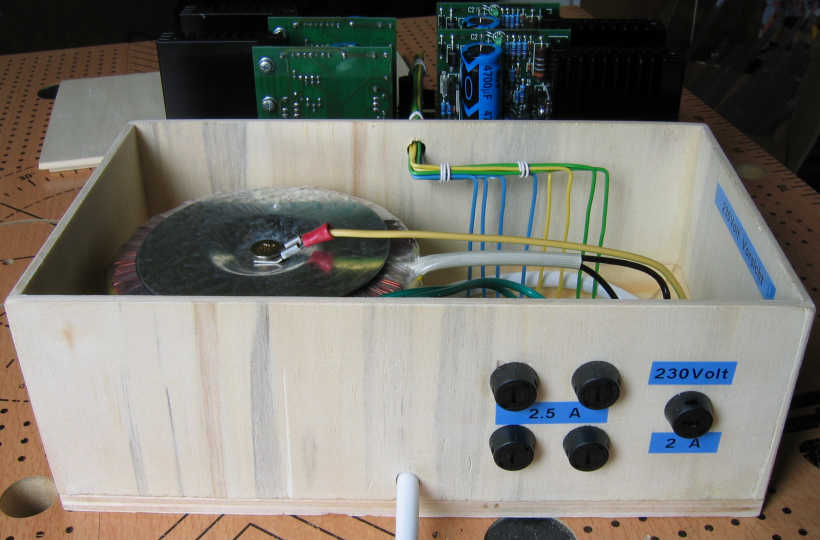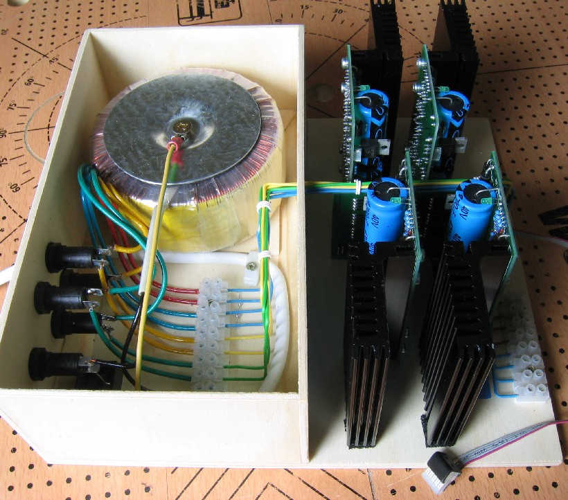 Schaltpläne zur Modelleisenbahnanlage Spur H0 5b. Booster KC25 - aus der kabasoft-computing Serie Und so könnte der Aufbau eines kompletten Boosters mit 4 x 2,5A und einem 220VA Ringkerntrafo aussehen. Da bei der Modellbahn ja meist mit Sperrholz gearbeitet wird, habe ich dies auch hier getan und auf ein teures Metall- oder Plastikgehäuse verzichtet.