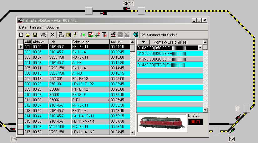 Workshops zur Modellbahnsteuerung mit Win-Digipet 9a. Erstellung eines Fahrplanes Nach der kompletten Erstellung des Fahrplans speichern sie die Daten unter einem gewünschten Dateinamen ab. Der Fahrplan sollte dann ungefähr so aussehen.